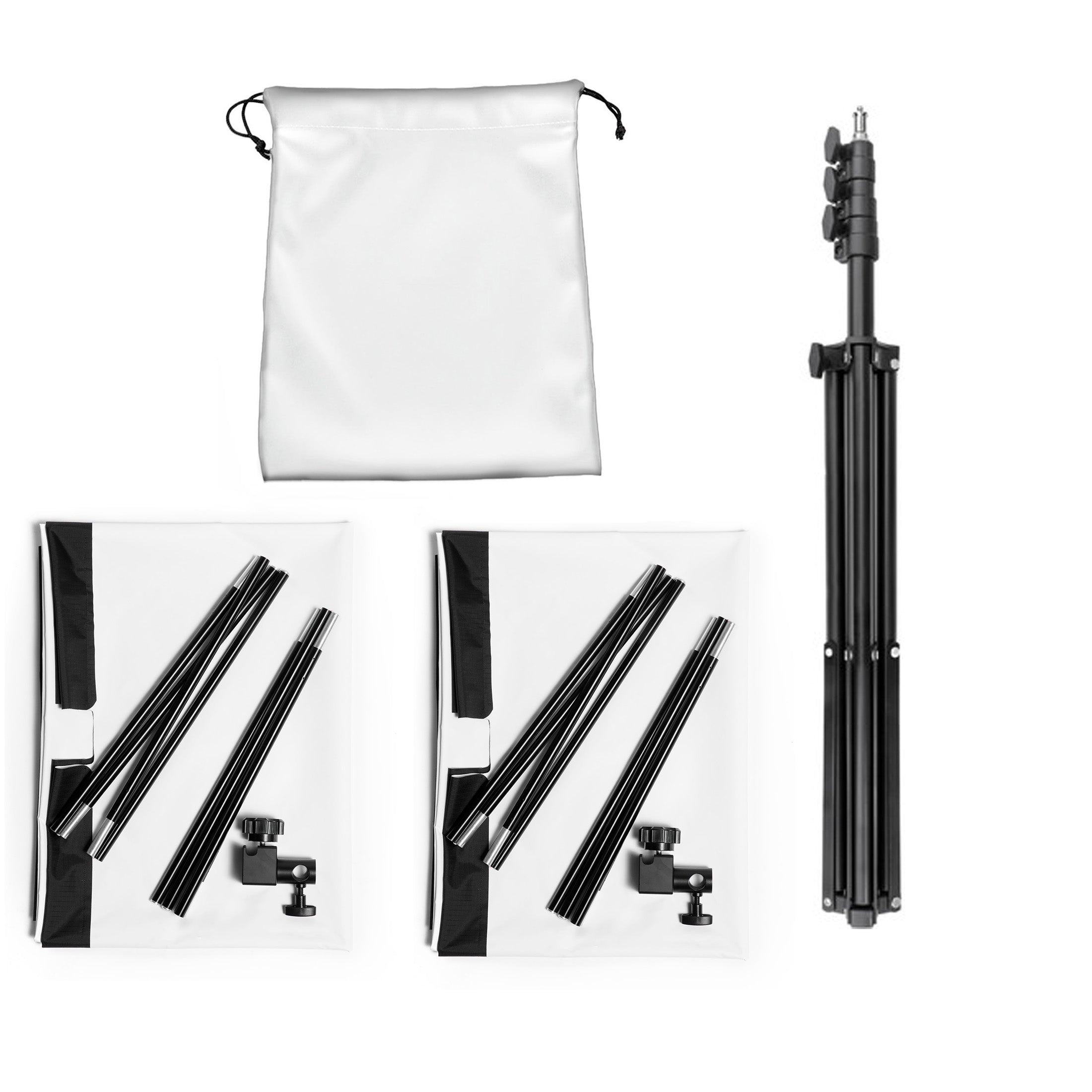 LavaFlat includes two collapsible poles. You only really need one, but you can insert a pole into the bottom pole pocket for a more rigid flat hanging panel. Additionally, you can loop the bottom pole back up to the top knob to create a 4'x4' panel. Just flip the panel for white or black.